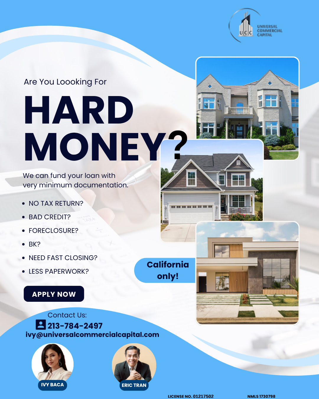 Eric Tran serves Universal Commercial Capital as its Chief Operating Officer and has served the real estate mortgage lending industry for nearly 30 years. He has worked in both residential and commercial lending, developing highly sought after products and processes for consumers and fellow real estate entrepreneurs.